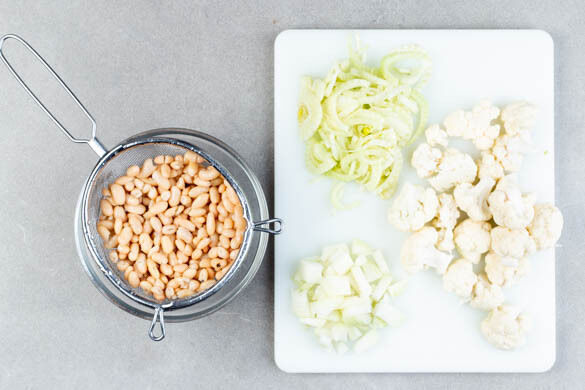 Die Blumenkohle in mundgerechte Röschen schneiden. Den Fenchel jeweils längs halbieren und quer in dünne Streifen schneiden, dabei die Strünke und die harten Stiele entfernen. Ggf. vorhandenes Fenchelgrün für die Garnitur beiseitelegen. Die Zwiebeln schälen, halbieren und grob würfeln. Die 1/2 der Bohnen in einem Sieb mit kaltem Wasser abspülen und abtropfen lassen.