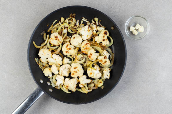 Den Blumenkohl, den Fenchel und die 1/2 der Zwiebeln in einer großen Pfanne mit 2EL Olivenöl und je 1 kräftigen Prise Salz und Pfeffer bei mittlerer bis starker Hitze in 7–9Min. goldbraun anbraten, dabei gelegentlich umrühren. Inzwischen den Knoblauch schälen und vierteln.