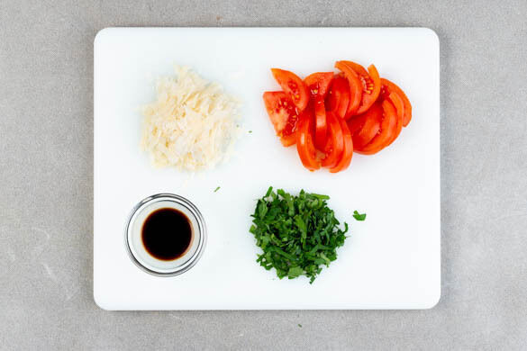 Die Tomaten halbieren und in dünne Scheiben schneiden. Die Petersilie samt Stängeln fein schneiden. Den Käse mit einem Sparschäler in feine Scheiben hobeln.