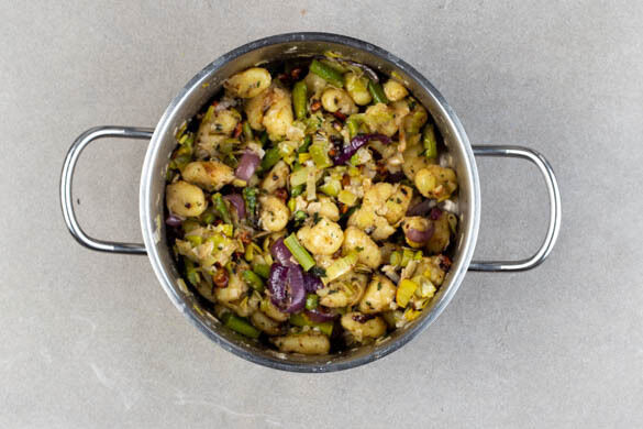 Mmmh, hier kommt ein richtiger Frühlingskracher! Frischer grüner Spargel und aromatischer Lauch werden im Ofen gebacken, während Knoblauch, Walnüsse und Salbeiblätter in der Pfanne schmurgeln. Schließlich wird alles mit fluffig-weichen Gnocchi vermengt und mit Käse dekoriert. Das sieht nicht nur frühlingshaft frisch aus, das duftet auch wahrhaft verführerisch – na, und schmecken tut’s erst recht! Guten Appetit!