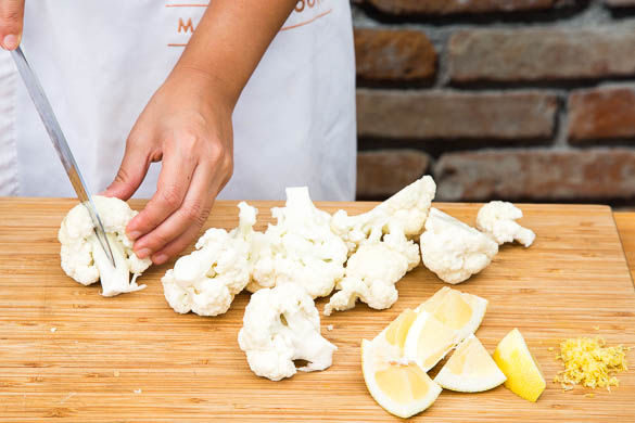 Die Schale der Zitrone abreiben. Die Zitrone halbieren und eine Hälfte entsaften und die andere Hälfte in Spalten schneiden. Den Strunk vom Blumenkohl entfernen und den Blumenkohl in mundgerechte Röschen schneiden.