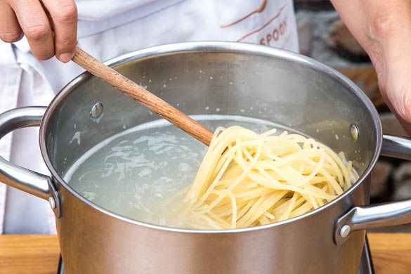 Währenddessen die Pasta für ca. 10Min. al dente kochen. Beim Abgießen 100ml Nudelwasser auffangen.