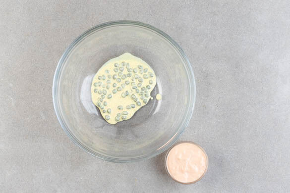Die Kapern, die ½ der Mayonnaise, ½TL Essig, ½TL Senf und 1 Prise Pfeffer zu einer Remoulade vermengen. Den Knoblauch schälen und fein würfeln, dann die ½ des Knoblauchs mit der restlichen Mayonnaise und 1EL Ketchup zu einem Dip verrühren.