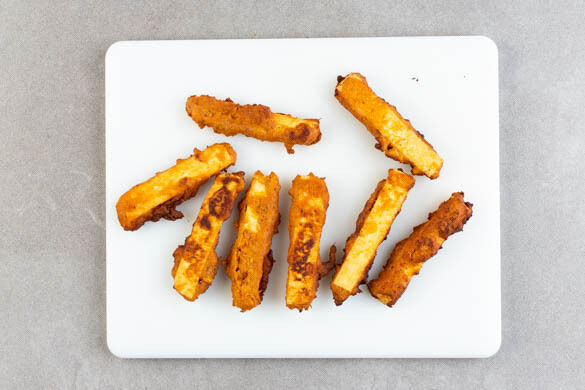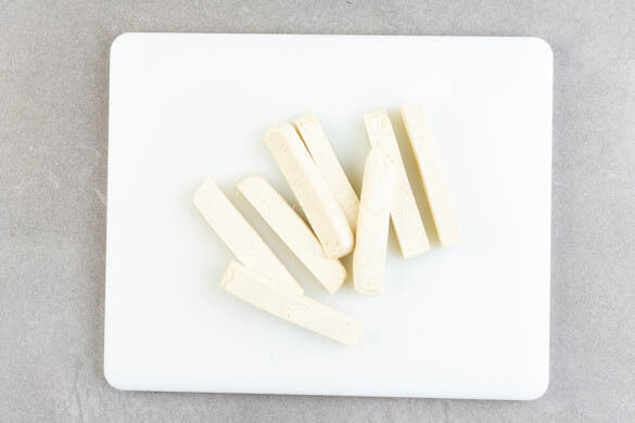 Eine große Pfanne oder einen Wok ca. 2cm hoch mit Pflanzenöl füllen und stark erhitzen. Tipp: Das Öl ist heiß genug, wenn ein Tropfen Teig darin in ca. 30Sek. braun wird. Den Tofu in 8 fingerdicke Stücke schneiden und trocken tupfen. Achtung: Im nächsten Schritt unbedingt portionsweise frittieren, der Tofu wird nicht knusprig, wenn die Pfanne zu voll ist!
