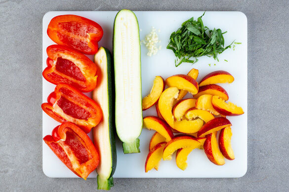Den Backofen mit Grillfunktion auf 250°C (oder die höchste Stufe) vorheizen. Die Paprika vierteln und entkernen. Die Zucchini längs halbieren. Die Nektarinen in Spalten schneiden, den Stein entfernen. Die Basilikumblätter abzupfen und fein schneiden, die Stängel grob schneiden. Den Knoblauch schälen und die 1/2 oder mehr fein würfeln.