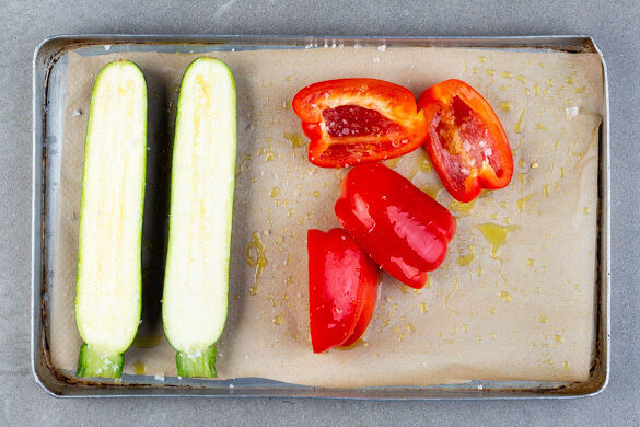 Die Zucchini mit 1EL Olivenöl bepinseln, mit 1/2TL Salz würzen und mit der Schnittseite nach oben auf ein mit Backpapier ausgelegtes Backblech legen. Die Paprika daneben legen, mit 2TL Olivenöl beträufeln und mit 1 kräftigen Prise Salz würzen.