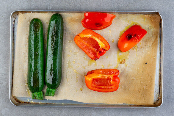 Die Zucchini und die Paprika im obersten Drittel des Ofens 10–15Min. grillen, bis sie appetitlich gebräunt sind. Nach der Hälfte der Zeit wenden. Achtung: Das Gemüse kann schnell zu dunkel wenden!
