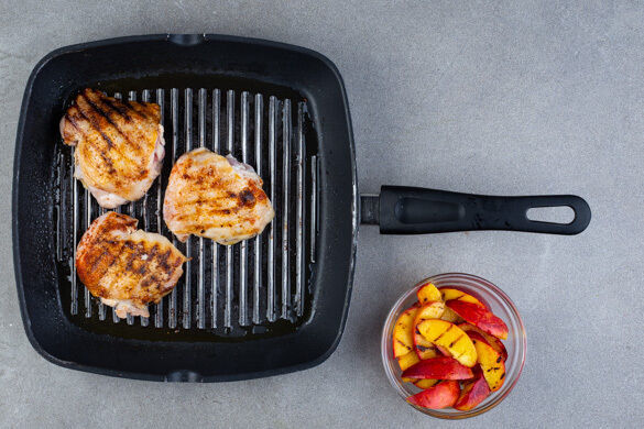 Die Nektarinen in einer Grillpfanne mit 2TL Olivenöl bei mittlerer Hitze auf jeder Seite 3–4Min. grillen, bis sie weich werden. Die Nektarinen herausnehmen und die Pfanne auswischen. Das Fleisch trocken tupfen, mit der 1/2 der Gewürzmischung, 1EL Olivenöl und 1/2TL Salz vermengen und in derselben Pfanne bei mittlerer bis starker Hitze 3–4Min. auf jeder Seite gar braten.
