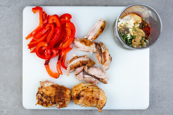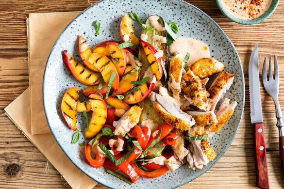 Röstaromen satt! So könnte man die wunderbare Vermählung von fruchtiger Nektarine mit aromatisch gewürztem Hähnchenschenkelfleisch beschreiben, das jeweils ein geschmackvolles Grillmuster trägt. Auch Zucchini und Paprika dürfen Bekanntschaft mit dem Grill schließen, allerdings im Ofen. Ein leicht rauchiges Paprika-Basilikum-Dressing macht die olfaktorische Reise in das Land der Röstaromen komplett deliziös.