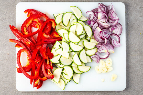 Die Paprika vierteln, entkernen und in lange, dünne Streifen schneiden. Die Zucchini längs halbieren und quer in dünne Scheiben schneiden. Die Zwiebel schälen, halbieren und in dünne Streifen schneiden. Den Knoblauch schälen und in feine Scheibchen schneiden.