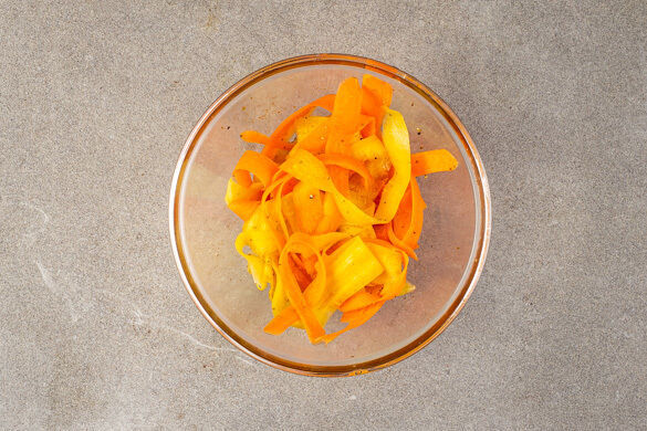 Die Karotten ggf. schälen und mit einem Sparschäler in feine Streifen schneiden. Den restlichen Limettensaft mit 2TL Limettenschale, der 1/2 des restlichen Kreuzkümmels, 2TL Honig, 2EL Pflanzenöl und je 1 kräftigen Prise Salz und Pfeffer verrühren. Die Karottenstreifen mit dem Dressing vermengen und nach Belieben mit mehr Kreuzkümmel abschmecken.