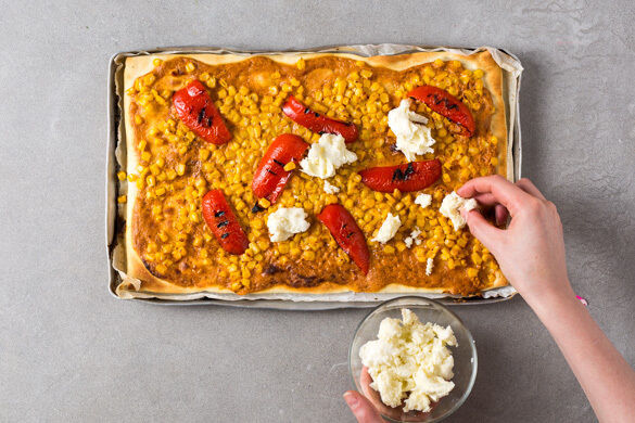 Den Backofen auf 240°C (220°C Umluft) vorheizen. Die Paprika halbieren, entkernen und in ca. 2cm breite Streifen schneiden. Die Zwiebeln schälen und in hauchdünne Ringe schneiden. Den Mais in einem Sieb abtropfen lassen.