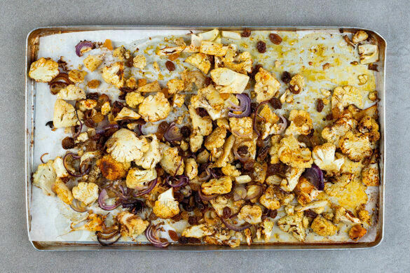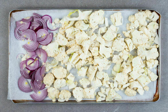 Den Backofen auf 220°C (200°C Umluft) vorheizen. Die Blumenkohle in ca. 2cm große Stücke schneiden. Die Zwiebel schälen, halbieren und in feine Streifen schneiden. Den Blumenkohl und die 1/2 der Zwiebeln auf einem mit Backpapier ausgelegten Backblech verteilen.