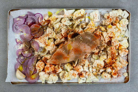 Das Fleisch trocken tupfen und mit den Knoblauchzehen samt Schale ebenfalls auf das Backblech legen. Tipp: Ggf. ein zweites Blech verwenden, wenn das erste zu voll ist. Das Gemüse und das Fleisch mit den Gewürzmischungen sowie mit 3–4EL Olivenöl vermengen und im Ofen 22–25Min. backen, bis das Fleisch gar und der Blumenkohl goldbraun ist.