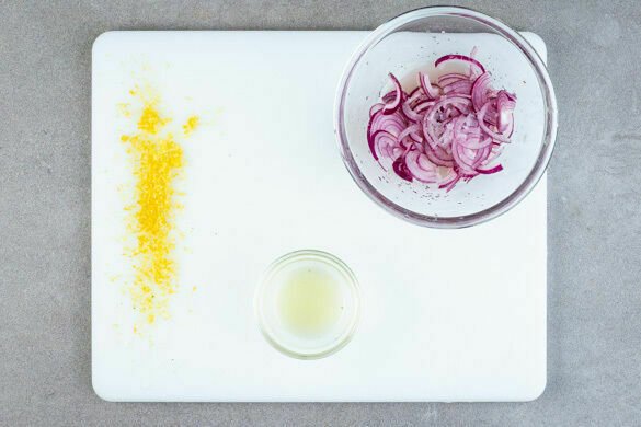 Die Zitronenschale abreiben, dann die Zitrone halbieren und auspressen. Die restlichen Zwiebeln mit der 1/2 des Zitronensafts, 2EL Essig, 1TL Zucker und 1/2TL Salz verrühren, bis sich Zucker und Salz aufgelöst haben, dann beiseitestellen und ziehen lassen.