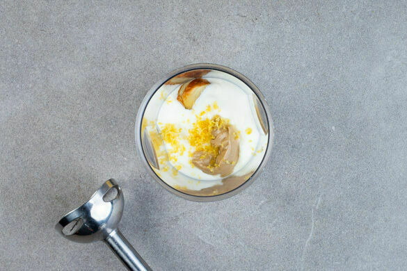 Den Knoblauch nach ca. 10Min. Backzeit aus dem Ofen nehmen und etwas abkühlen lassen. Den Knoblauch schälen und mit der Zitronenschale, dem Joghurt und dem Tahini in einem hohen Gefäß mit einem Stabmixer cremig pürieren. Die Sauce mit Salz und Pfeffer abschmecken.