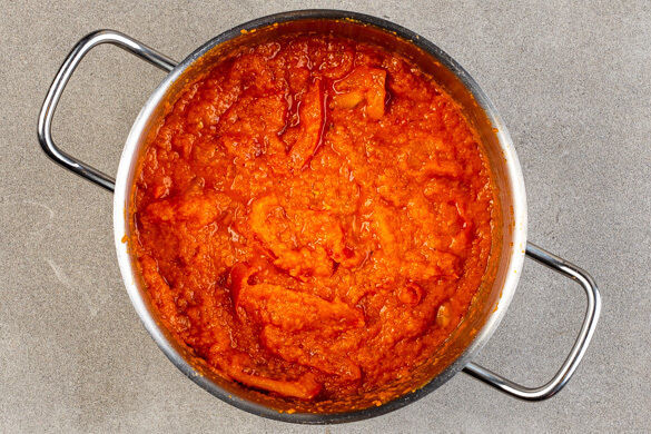 In einem großen Topf 2EL Butter bei mittlerer Hitze schmelzen lassen, dann die Würzpaste hinzugeben und unter Rühren ca. 3Min. anbraten, bis die Würzpaste etwas eingekocht ist. Die Tomaten dazugeben und ca. 3Min. mitbraten, dabei mit dem Kochlöffel etwas zerdrücken.