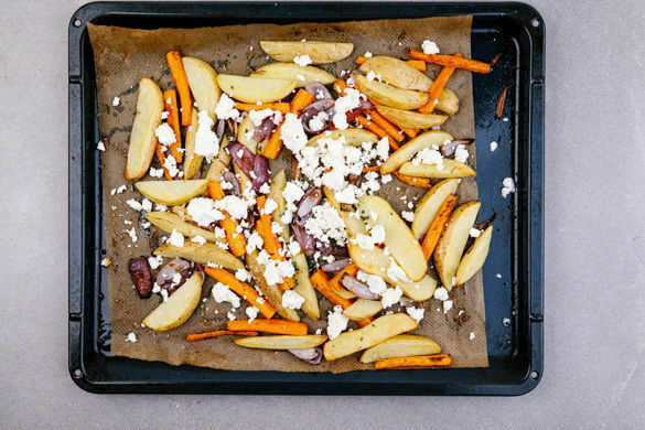 Die Zwiebeln, den Knoblauch, die Karotten und die Kartoffeln auf einem mit Backpapier ausgelegten Backblech verteilen und 20–25Min. im Ofen backen.