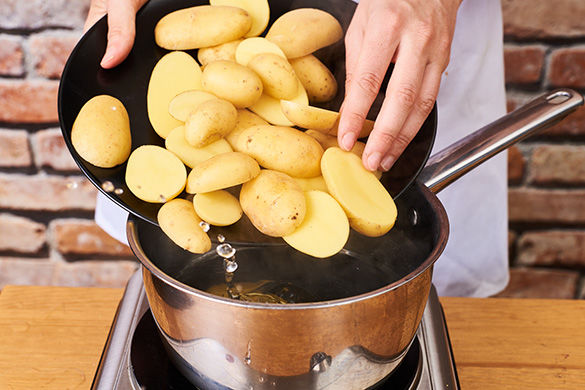 In einem großen Topf ausreichend gesalzenes Wasser zum kochen bringen. Die Kartoffeln längs halbieren, im kochenden Wasser ca. 12Min. garen. Durch ein Sieb abgießen und ausdampfen lassen.