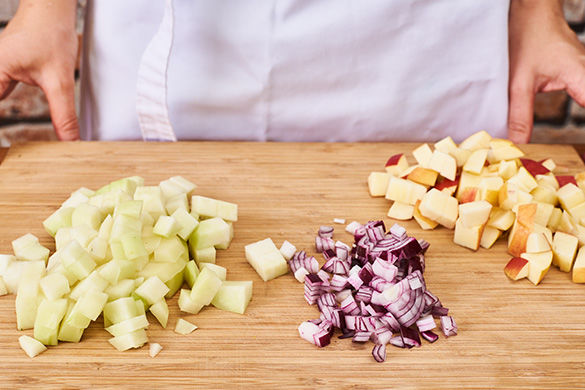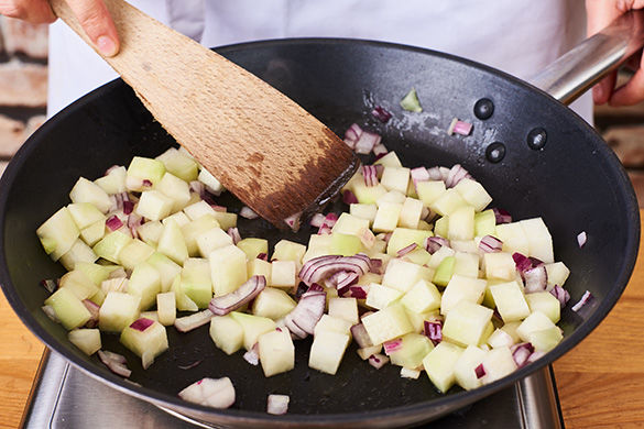 Den Kohlrabi schälen und in 1cm große Würfel schneiden. Die Zwiebel schälen, halbieren und in grobe Würfel schneiden. Die Äpfel vierteln, vom Kerngehäuse befreien und in 1cm große Würfel schneiden.