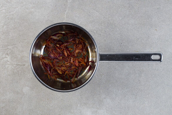 1EL Zucker in einem kleinen Topf bei mittlerer Hitze schmelzen, dabei nicht umrühren. Die Zwiebeln sowie 1 Prise Salz und 1EL Essig hinzufügen und bei niedriger Hitze unter gelegentlichem Rühren 2–3Min. karamellisieren, bis die Zwiebeln weich werden.