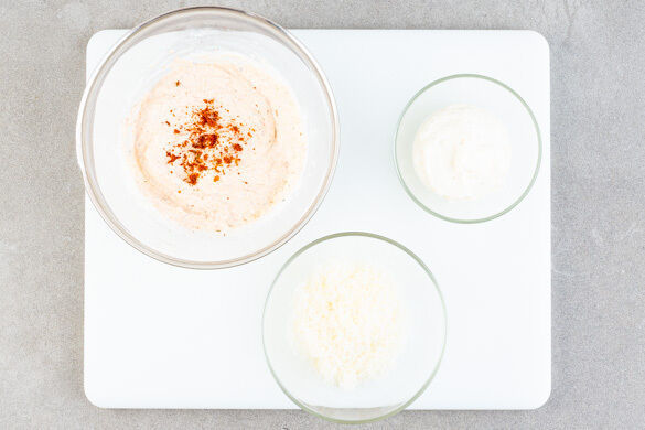 Den Käse fein reiben. Die Crème fraîche mit ca. 2/3 des Käses verrühren und mit 1 Prise Salz und Pfeffer würzen. 2–3EL Käsecreme für die Garnitur beiseitestellen. Die restliche Käsecreme mit der 1/2 der Gewürzmischung verfeinern.