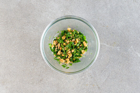 Die Erdnüsse grob hacken. Den Koriander ohne grobe Stängel grob schneiden. Die Erdnüsse, den Koriander und die Limettenschale vermengen. Die Rindfleisch-Paprika-Pfanne auf dem Reis anrichten und mit den Koriander-Erdnüssen garniert servieren.