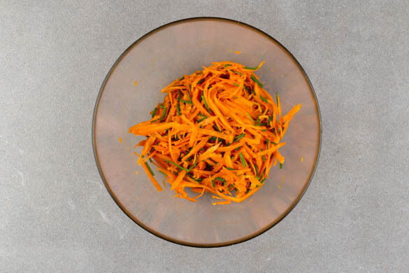 Ca. 1TL Ingwer schälen, fein reiben und mit 2TL Pflanzenöl, 1EL Essig, 1/2TL Zucker und 1 Prise Salz verrühren. Die Karotte ggf. schälen und grob raspeln. Den Schnittlauch in ca. 1cm breite Röllchen schneiden. Die Karotten mit dem Schnittlauch und dem Dressing zu einem Salat vermengen und mit Pfeffer abschmecken.