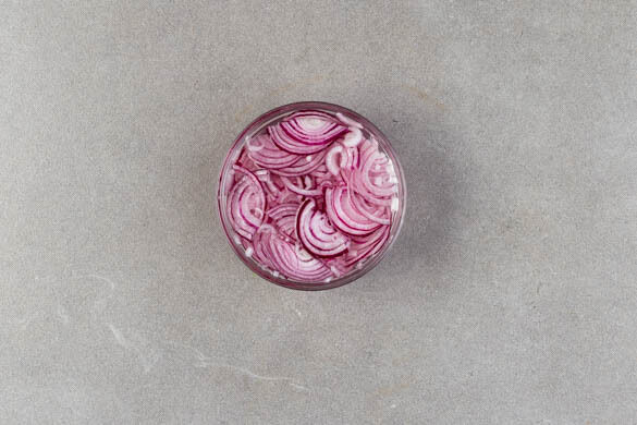 Den Backofen auf 200°C (180°C Umluft) vorheizen. Die Zwiebel schälen, halbieren und in feine Streifen schneiden, dann in 1EL Essig und 100ml Wasser einlegen.