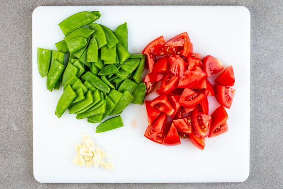 In einem mittelgroßen Topf ausreichend gesalzenes Wasser für die Pasta zum Kochen bringen. Den Knoblauch schälen und in feine Scheibchen schneiden. Die Tomate in 2–3cm große Stücke schneiden und die Zuckererbsen halbieren.