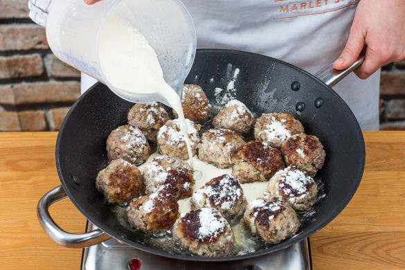 In einer großen Pfanne 2-3EL Öl erhitzen, die Bouletten ca. 5-7Min. ringsherum braten, bis das Fleisch durch ist. Zum Schluss mit 1EL Mehl bestäuben. Nun die Sahne, 100ml Wasser und 1TL Marmelade dazu geben und ca. 2-3Min. einköcheln lassen, mit Salz und Pfeffer abschmecken. Mit dem Püree servieren und nach Geschmack mit restlicher Marmelade garnieren.