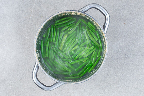 In einem mittelgroßen Topf 1L Wasser mit 1/2TL Salz zum Kochen bringen. Die Enden der Bohnen entfernen und die Bohnen quer halbieren. Den Bulgur in das kochende Wasser geben und ca. 10Min. kochen. Nach 3–5Min. die Bohnen zugeben und mitgaren. In einem feinmaschigen Sieb abtropfen und abkühlen lassen.