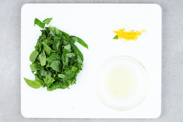 Die Basilikumblätter und die Minzblätter abzupfen und grob schneiden. Die Petersilie samt Stängeln grob hacken. Die Zitronenschale abreiben, dann die Zitronen halbieren und auspressen.