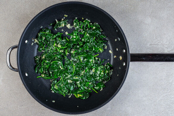 Den Backofen auf 240°C (220°C Umluft) vorheizen. Die Zwiebel schälen, halbieren und fein würfeln, dann in einer großen Pfanne mit 1EL Olivenöl und 1/2TL Salz bei mittlerer Hitze ca. 3Min. glasig anschwitzen. Den Spinat hinzufügen und ca. 5Min. mitgaren, bis er zusammenfällt. Den Spinat in ein Sieb geben und so viel Flüssigkeit wie möglich auspressen.