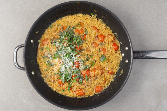 Im Italienischen bedeutet das Wort „Orzo" Gerste, während in anderen Teilen der Welt die reisförmige Pastasorte Risoni damit gemeint ist. Nur um Missverständnissen vorzubeugen: Das heutige Gericht ist gerstenfrei, man könnte also auch von einem „Risoniotto" sprechen. Wie man es auch nennt, lecker ist es auf jeden Fall! Kirschtomaten sind die Basis, mit Spinat, Zitrone und Basilikum wird’s besonders aromatisch. Yum!