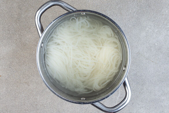 Die Nudeln in das kochende Wasser geben und gut umrühren. Den Topf vom Herd nehmen und die Nudeln ohne Hitzezufuhr ca. 8Min. ziehen lassen. In ein Sieb abgießen und kalt abschrecken.