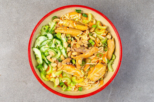 Die Nudeln, das Fleisch und das Gemüse auf Schalen verteilen, mit den Lauchzwiebeln, dem restlichen Sellerie und den restlichen Gurkenscheiben anrichten und mit den Erdnüssen garniert servieren.