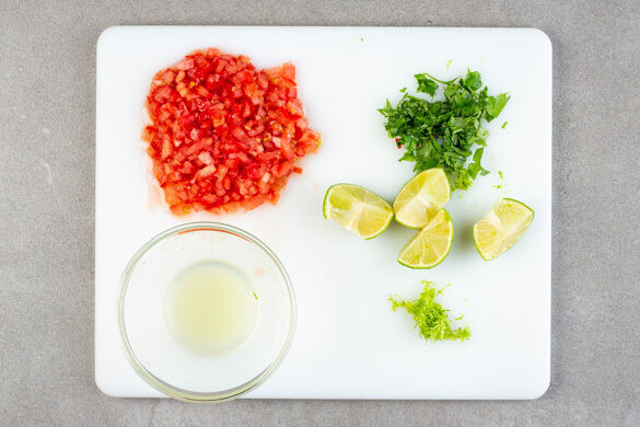 Inzwischen die Tomate in ca. 0,5cm große Stücke schneiden. Die 1/2 der Korianderblätter fein schneiden. Die Schale einer Limette abreiben, dann die Limette auspressen. Die andere Limette in Spalten schneiden.