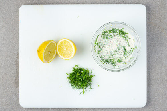 Die Zitronen halbieren und auspressen. Den Dill samt Stängeln grob schneiden. Die 1/2 des Dills mit 1EL Senf, 1EL Zitronensaft und 4EL Mayonnaise verrühren. Die Sauce mit Salz und Pfeffer abschmecken.