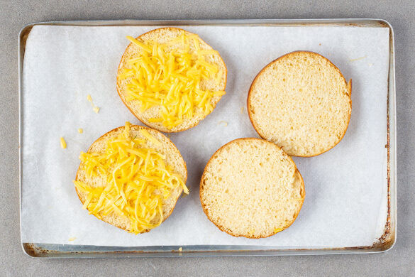 Die Brötchen aufschneiden und auf einem mit Backpapier ausgelegten Backblech verteilen. Die oberen Brötchenhälften mit dem Käse belegen, dann alles im Ofen ca. 4Min. backen, bis der Käse geschmolzen ist und die Brötchen knusprig sind.