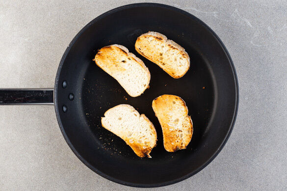Die Brötchen der Länge nach in 4 Scheiben schneiden, dabei ggf. etwas begradigen, sodass die Scheiben flach aufliegen. Dann in einer großen Pfanne ohne Zugabe von Fett bei mittlerer Hitze auf jeder Seite 2–3Min. goldbraun anrösten. Auf einem Teller beiseitelegen.