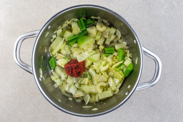Die 1/2 des Fenchels, die breiten Selleriestücke und die Zwiebeln in einem großen Topf mit 2EL Olivenöl bei mittlerer Hitze ca. 3Min. anbraten. Das Tomatenmark unterrühren und ca. 1Min. erhitzen.