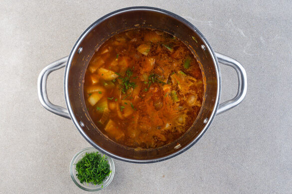 Das Gemüse mit dem heißen Wasser aus dem Wasserkocher ablöschen. Das Brühgewürz unterrühren und die Suppe ca. 10Min. abgedeckt köcheln lassen, bis der Fenchel zart ist. Inzwischen die Dillspitzen abzupfen, grob schneiden und beiseitelegen. Die Dillstängel klein schneiden und in die Suppe geben.