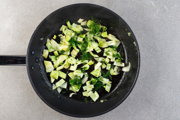 Den restlichen Fenchel in der Pfanne mit 1EL Olivenöl und 1 Prise Salz bei mittlerer Hitze ca. 5Min. braten, bis der Fenchel weich wird. 1EL Olivenöl, 1–2TL Essig und 1 Prise Pfeffer unterrühren. Mit Salz und ggf. mehr Essig abschmecken, dann die 1/2 der Dillspitzen untermischen. Tipp: Wer mag, kann den Fenchel für die Crostini mit einem Stabmixer pürieren.