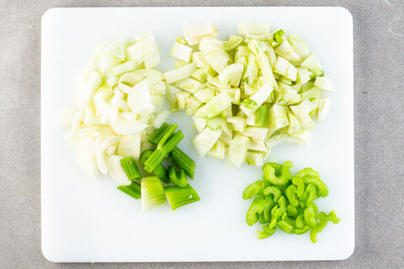 Den Fenchel in mittelgroße Würfel schneiden, dabei den Strunk entfernen. 1 Stangensellerie in breite Stücke, den übrigen Stangensellerie in dünne Streifen schneiden. Die Zwiebel schälen, halbieren und grob würfeln. 500ml Wasser in einem Wasserkocher aufkochen.