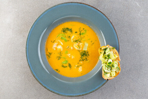 Mit dieser cremigen Suppe aus Fenchel und Sellerie wird einem ganz warm ums Herz! Zarte Garnelen machen aus einer rustikalen Speise ein edles Mahl. Dazu gibt es knusprige Crostini mit gebratenem Fenchel und aromatischem Dill. Heiß geliebt und gern gelöffelt!