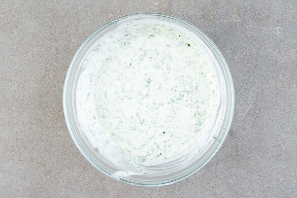 Den Dill samt Stängeln fein schneiden. Die Minzeblätter abzupfen und ebenfalls fein schneiden. Die Kräuter und je 1EL Olivenöl und Essig in den Joghurt rühren und den Dip mit Salz und Pfeffer abschmecken.