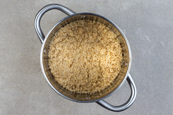 In einem mittelgroßen Topf 700ml leicht gesalzenes Wasser zum Kochen bringen. Die Quinoa in einem feinmaschigen Sieb mit warmem Wasser abspülen, in das kochende Wasser geben und 10–12Min. abgedeckt bei niedriger bis mittlerer Hitze sanft köcheln lassen. Vom Herd nehmen und bis zum Servieren warm halten.