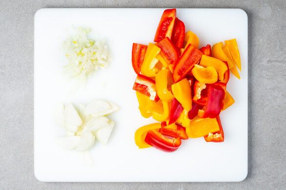 Die Paprika vierteln, entkernen und in dünne Streifen schneiden. Die Zwiebel schälen und halbieren, eine Hälfte in feine Würfel, die andere Hälfte in Streifen schneiden.