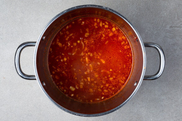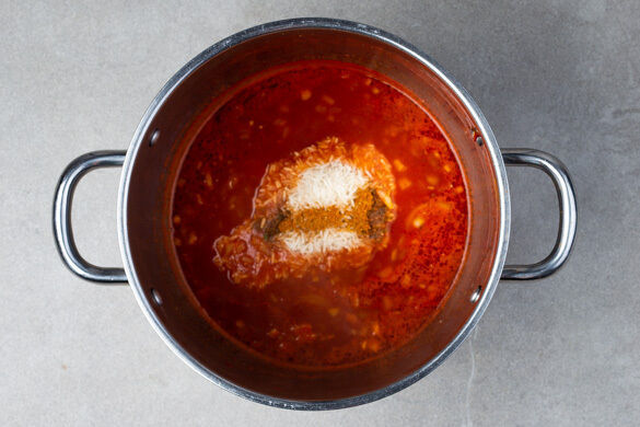 Den Reis und das Gulaschgewürz unterrühren und abgedeckt bei niedriger Hitze 12–15Min. sanft köcheln lassen, dabei gelegentlich umrühren. Falls nötig, etwas mehr Wasser zugeben. Den Topf vom Herd nehmen und den Reis noch 5Min. abgedeckt ziehen lassen.